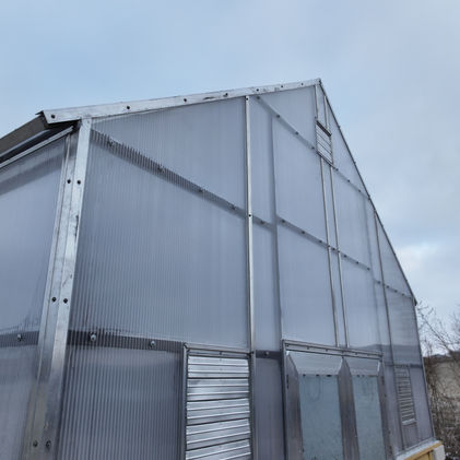 In a small development in Bennington, the tornado damaged homes and destroyed a small greenhouse attached to an outbuilding. The contractor in charge of repairing the home on this property contacted Quality Structures to rebuild the greenhouse. Due to the non-standard size, and the need to match the profile of the existing building, Quality Structures built the greenhouse from scratch, pre-fabricating and welding the walls and trusses off-site. The roof is sheeted in polycarbonate while the sidewalls are sheeted in twin-wall acrylic panels for increased light transmission. Finishing off the build is a beautiful aluminum double hung door from HC Quality Doors